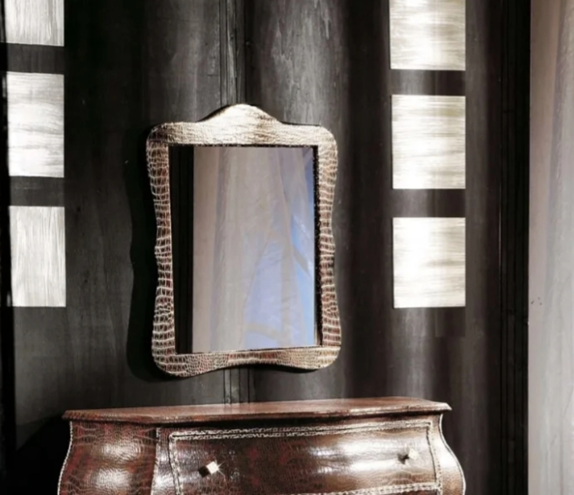 Specchiera sagomata in pelle di Fratelli Mirandola in pelle: fa parte della ricca offerta di Complementi moderni del noto e conosciuto marchio, sempre di grande qualità. Dopo avere acquistato gliarredi per la tua casa, dovrai vestire gli spazi indoor con i multifunzionali Complementi di grande impatto estetico che proponiamo. Nella selezione di mobili ed elementi accessori di qualità per la casa, è essenziale accostare in un ben dosato incontro le doti di estetica e di praticità. Per i materiali, i Complementi moderni garantiscono molteplici risultati estetici per arredare gli ambienti secondo le proprie necessità.