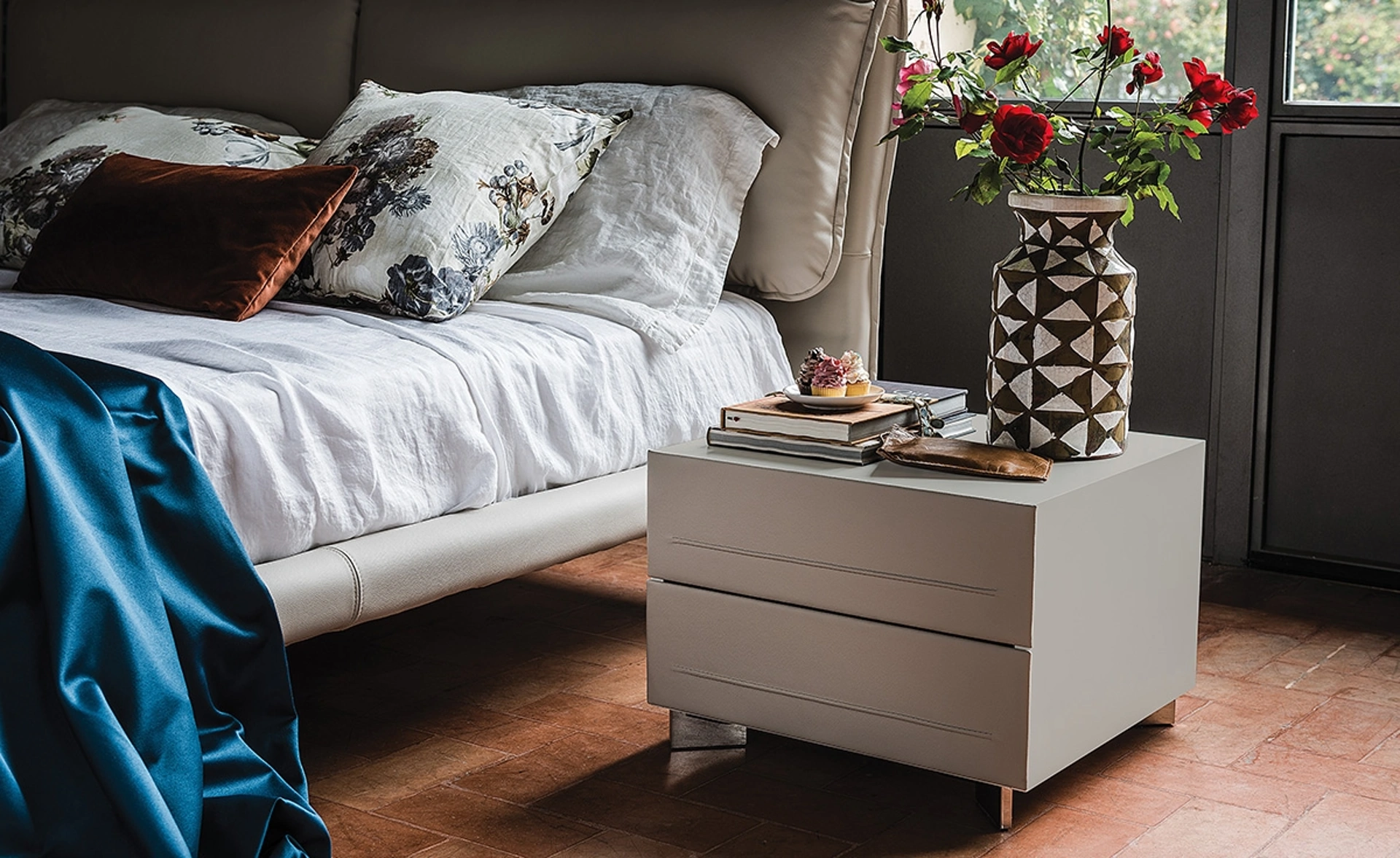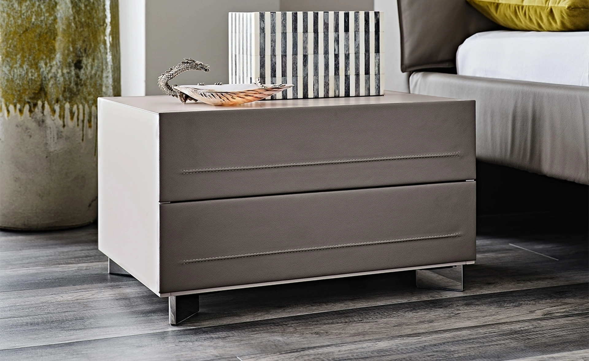 Con i nostri gruppi notte design della firma Cattelan Italia, leader dell’Arredamento Casa per la zona notte, potrai ricreare la camera che hai sempre desiderato. Ottimizza i tuoi locali scegliendo composizioni di pezzi abbinati o ricrea voluti accostamenti di stile e tonalità grazie al catalogo di mobili ed elementi accessori per la zona notte che proponiamo, come il modello in pelle visibile in foto, anche realizzabili su misura per te. Comodino Dyno di Cattelan Italia: contattaci e scopri di più sulle nostre composizioni e arreda la camera come l'avevi sognata.