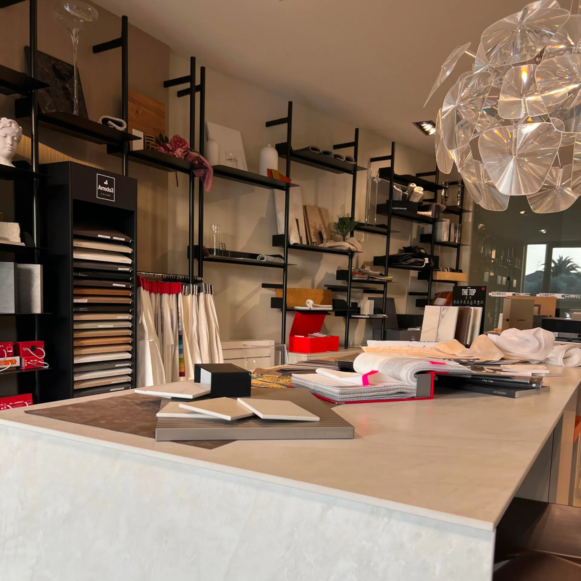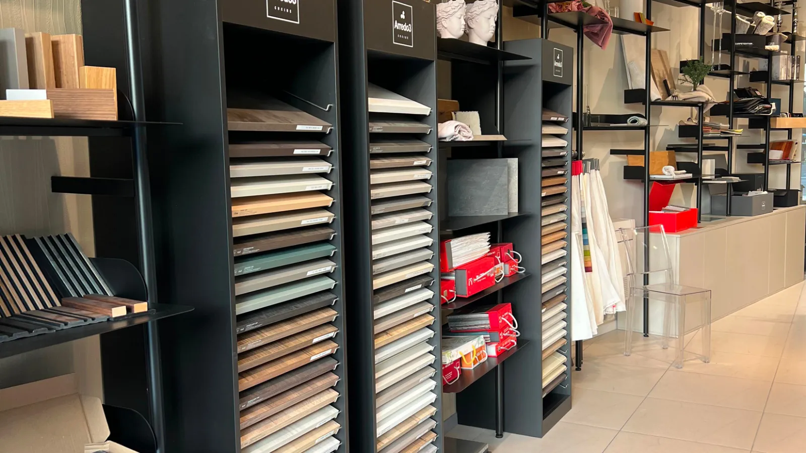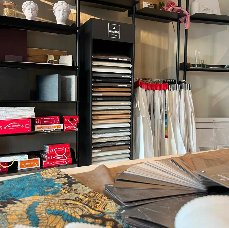 A pochi chilometri di distanza dall'altro, questo spazio espositivo si distingue per il suo carattere di materioteca. Qui il cliente può esplorare liberamente un’ampia selezione di ante e campioni materiali delle nostre aziende partner, abbinandoli, spostandoli e componendo soluzioni uniche e personalizzate. Collaboriamo con aziende affidabili per offrire arredi di qualità, personalizzabili e pensati per chi desidera ambienti curati e ricchi di personalità.