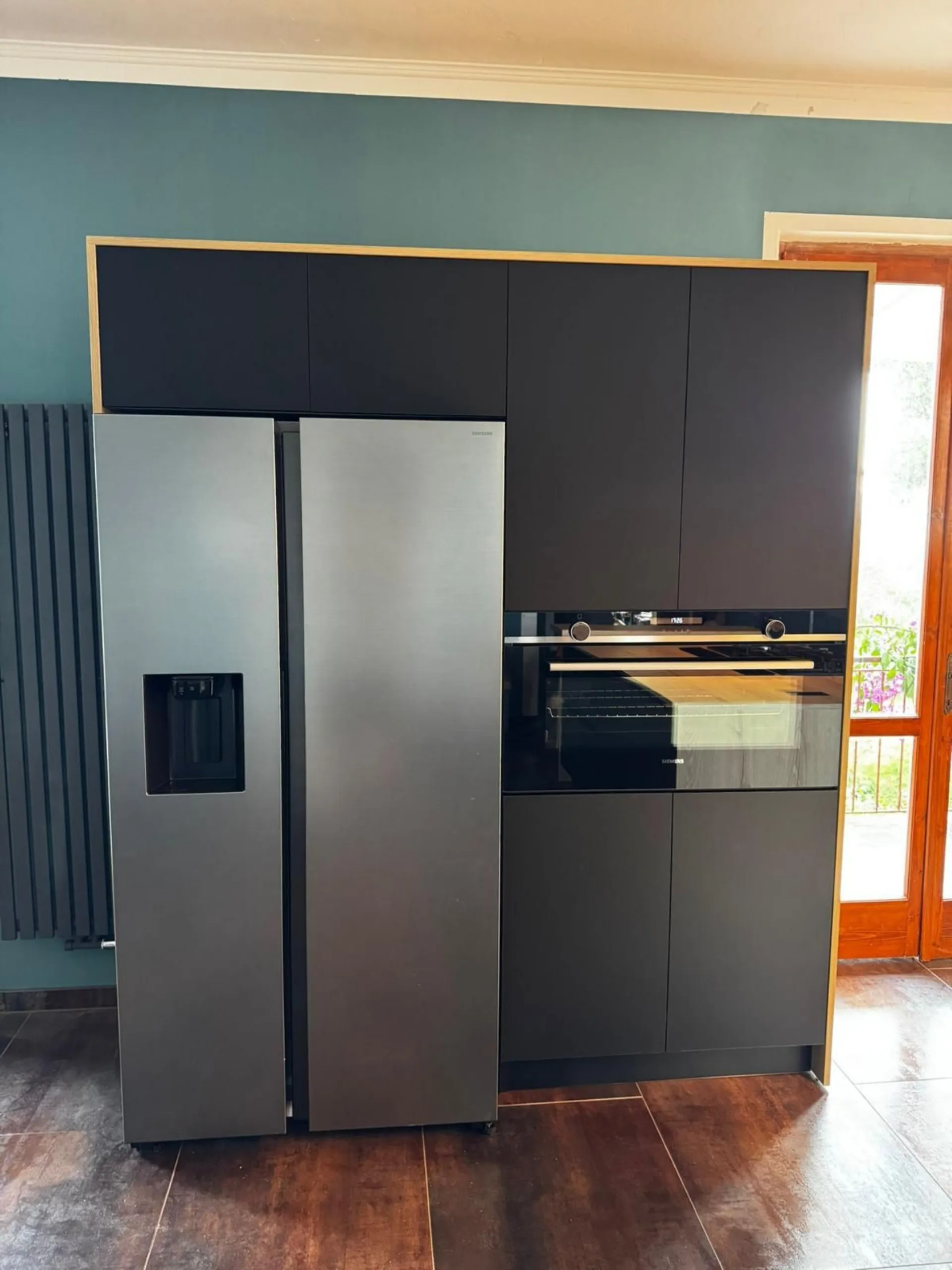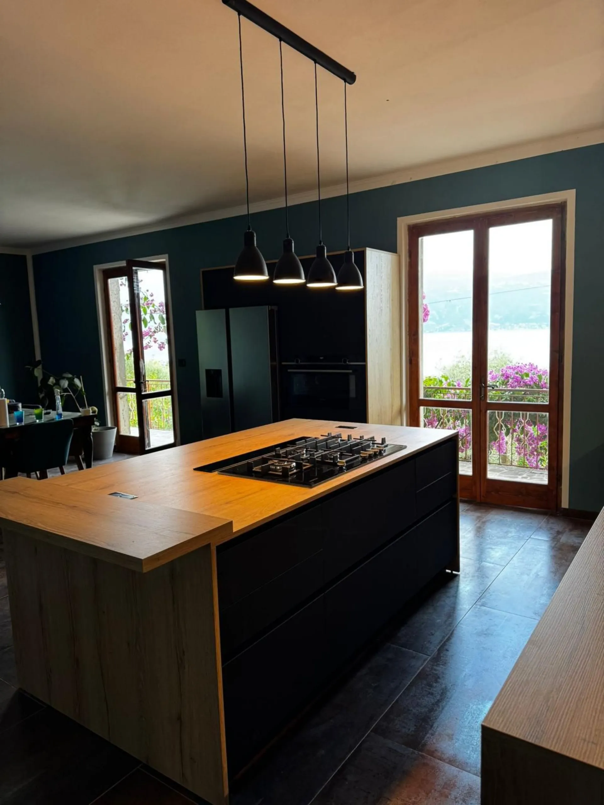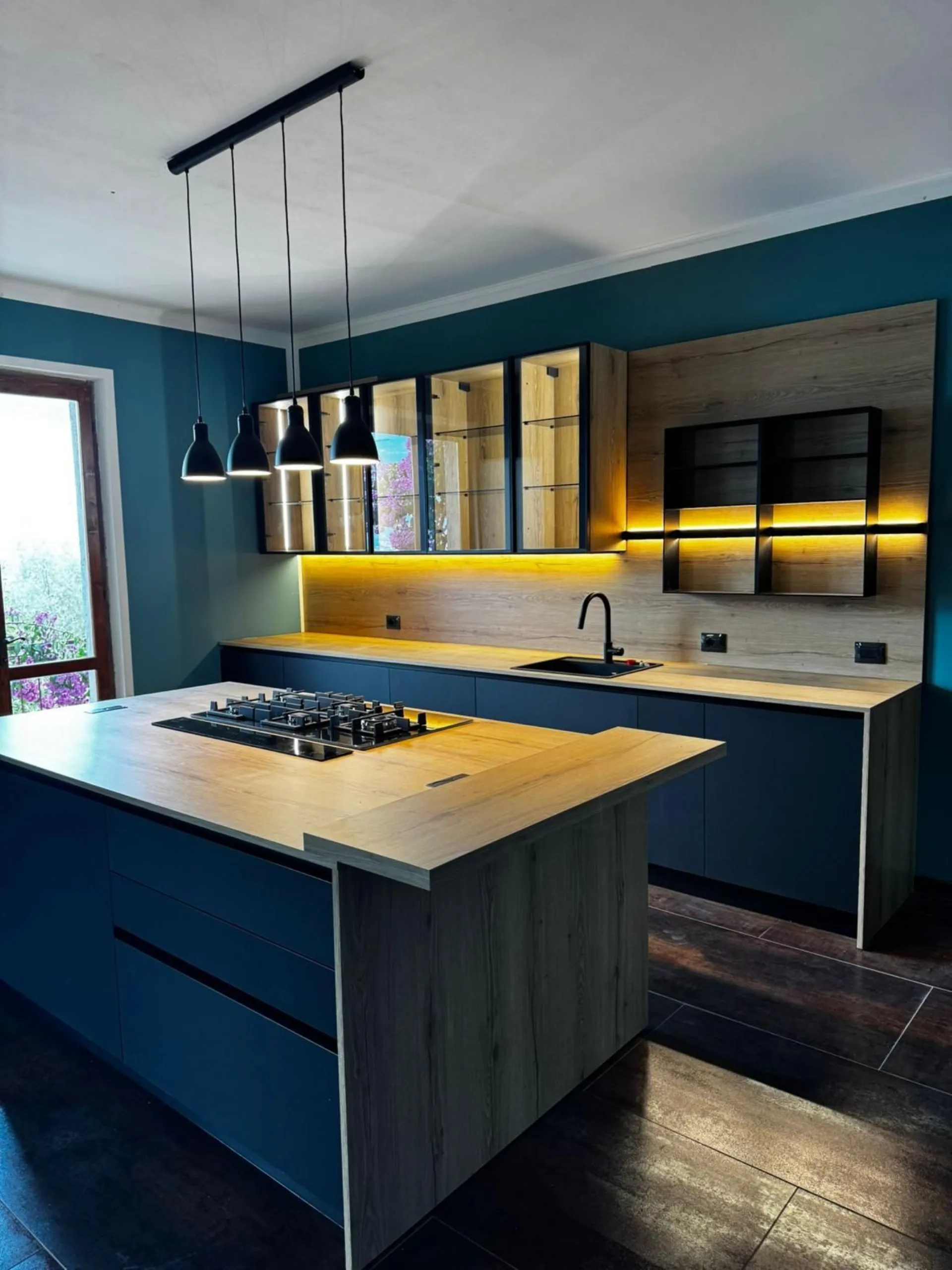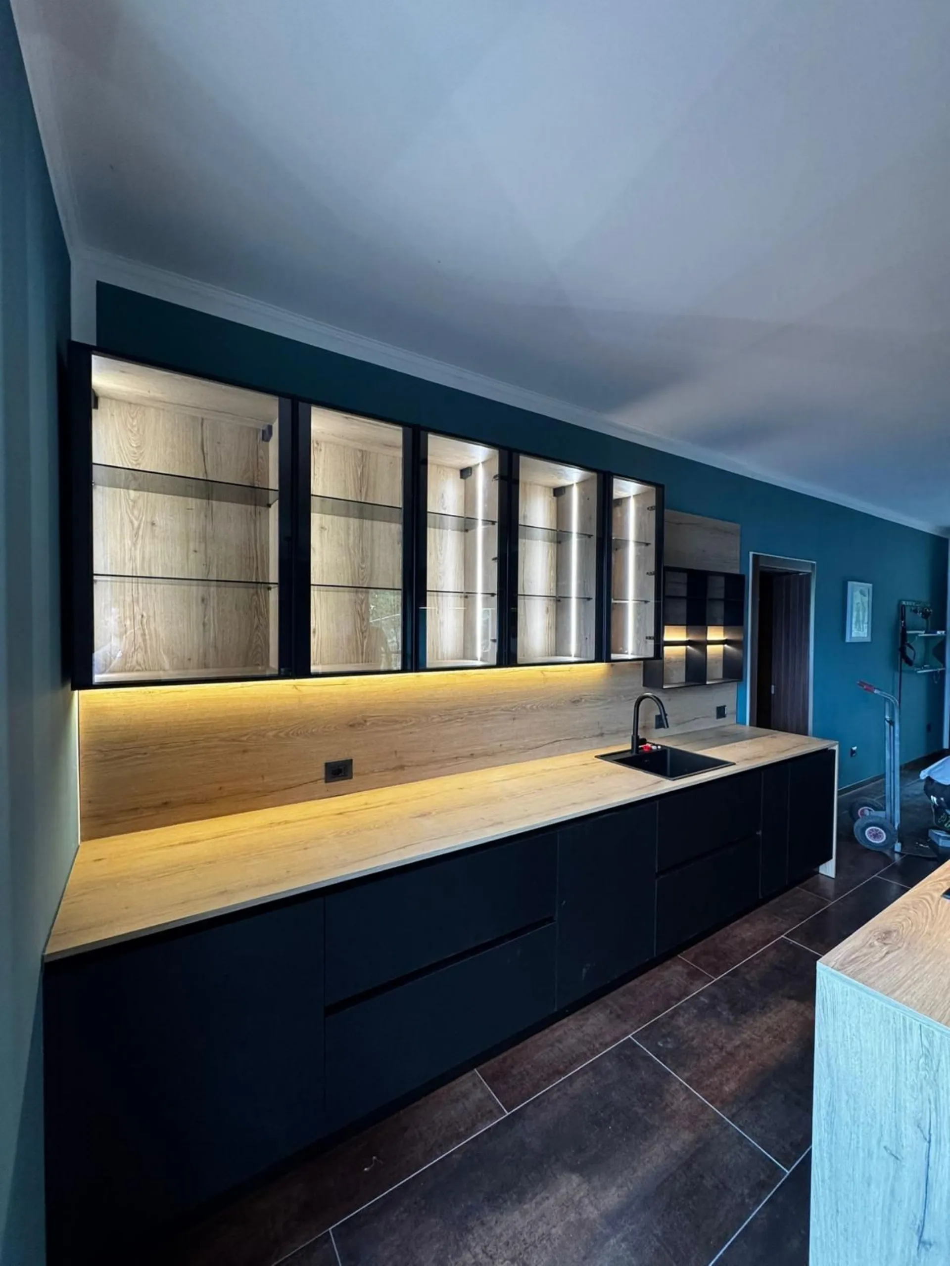 Questa cucina è stata progettata per evocare un’eleganza moderna e decisa, grazie a una palette che ruota attorno alle tonalità del nero. La composizione principale si sviluppa interamente a parete, creando un fronte lineare e pulito che ospita basi, colonne e aree operative in modo funzionale e armonioso. Al centro dello spazio si trova l’isola, pensata come fulcro estetico e pratico della cucina: un elemento scultoreo che, con le sue superfici scure e raffinate, definisce immediatamente il carattere dell’ambiente. A impreziosire il progetto, una serie di vetrine illuminate che aggiungono leggerezza visiva e un tocco di pregio. La luce interna mette in risalto oggetti e complementi, creando un effetto scenografico che dialoga perfettamente con le finiture profonde e materiche del resto della cucina. Il risultato è un ambiente elegante, contemporaneo e ricco di personalità, dove funzionalità e stile convivono in un equilibrio impeccabile.